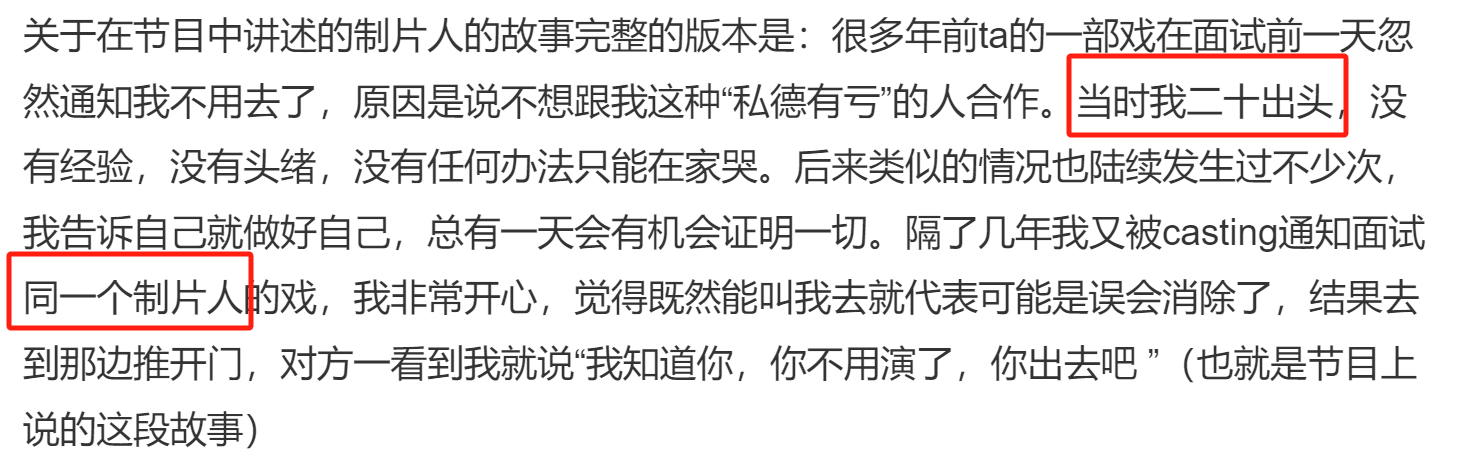 而后面黄灿灿写的额“隔了几年我又被casting通知面试同一个制品人的戏”,结果就遭遇了“我知道你,你不用演了,你出去吧。”虽然黄灿灿没有点名,但很难不让人将她写的制片人和杨晓培对号入座。